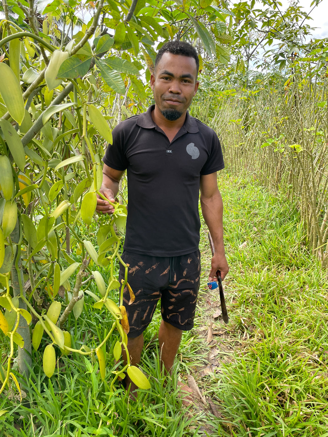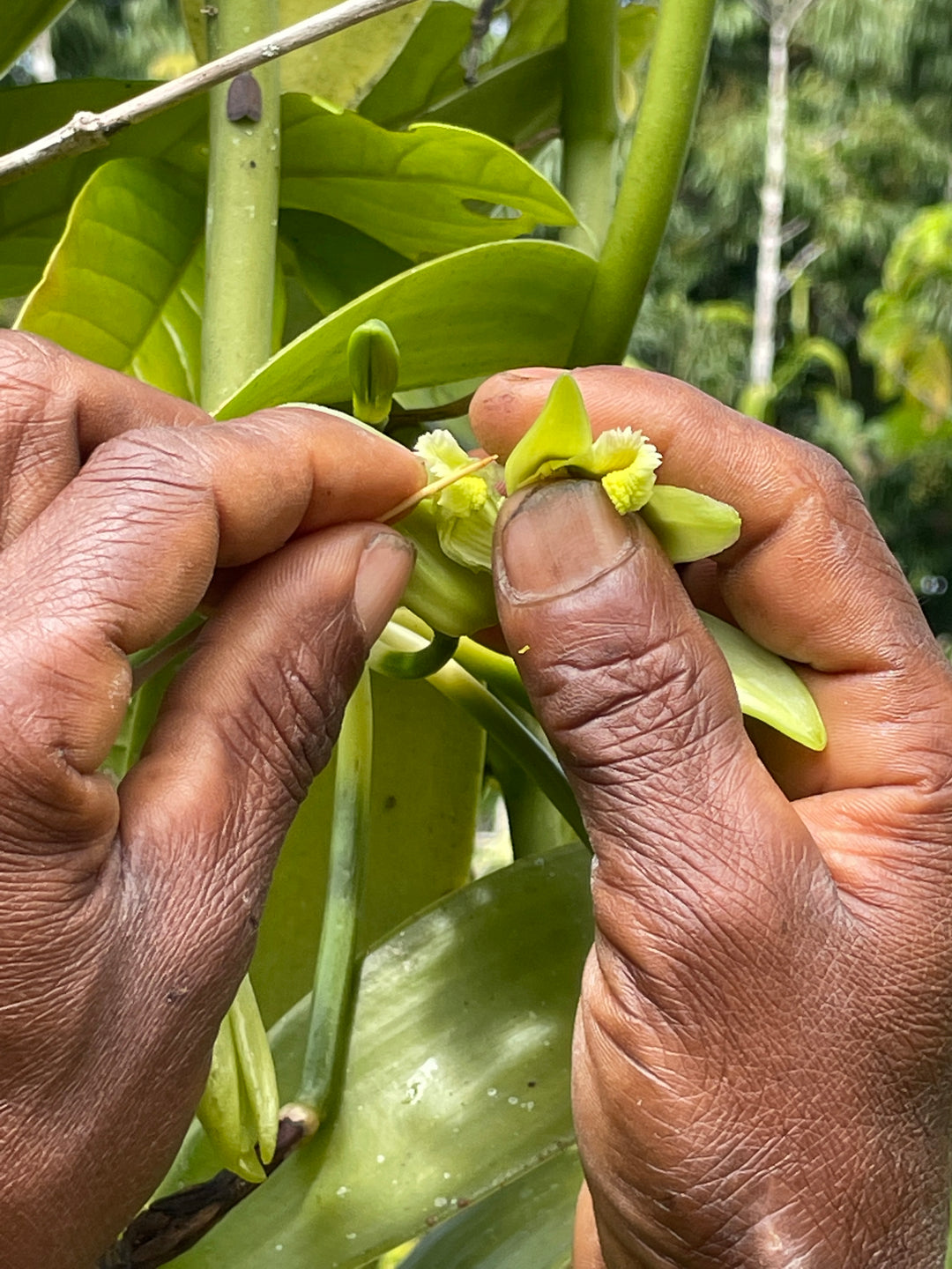 anders kann man die viele Handarbeit nicht beschreiben, die für den Vanilleanbau notwendig ist. Denn selbst die Bestäubung der Blüte muss von Hand durchgeführt werden. Hier sehen wir den freundlichen Yockno - Vanillebauer in 2. Generation